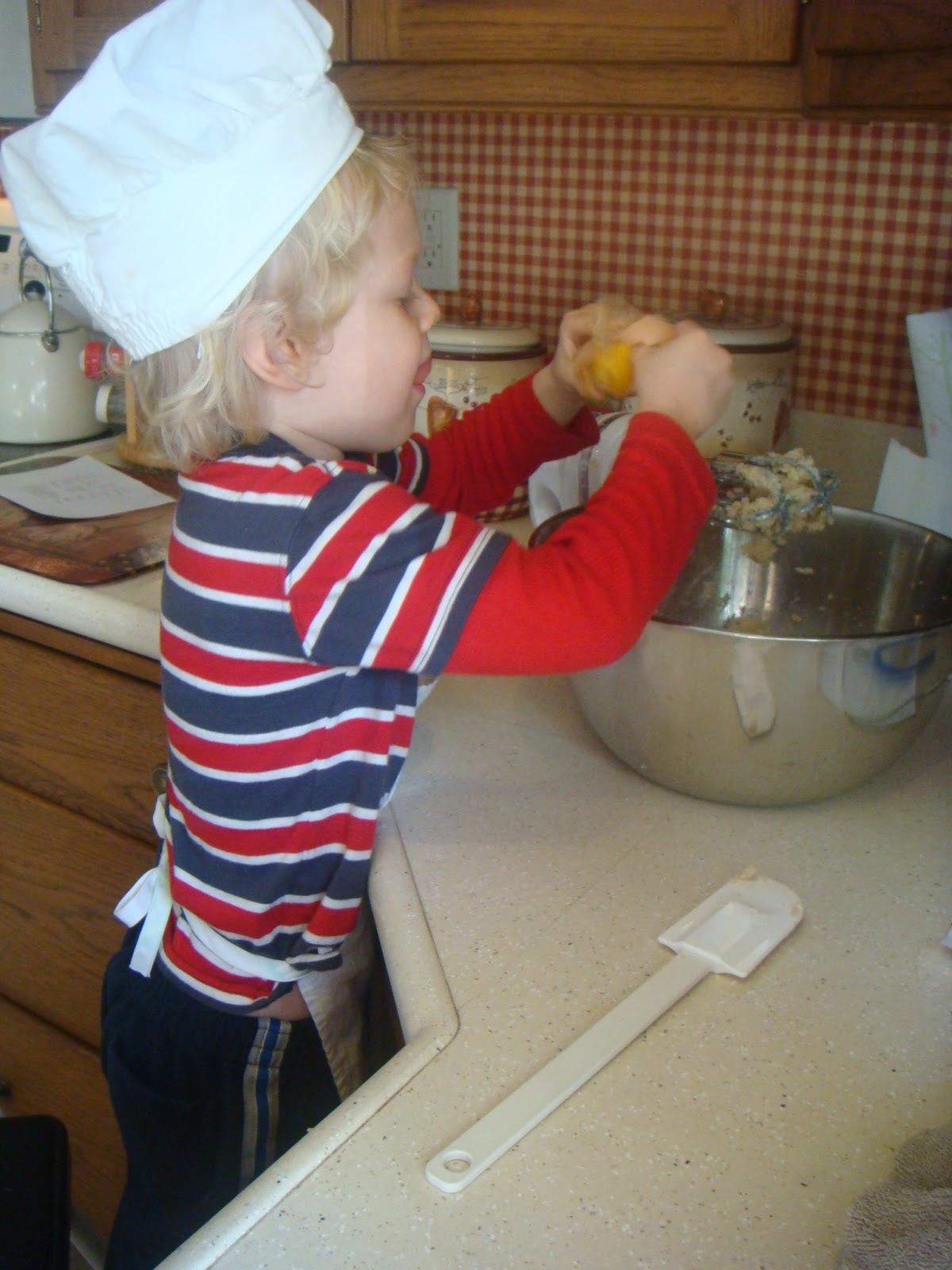 Breaking the eggs, "by myself" i'm pretty sure i didn't let the others do this till they were 5, but then again they didn't kick and scream over the matter either. Check out the tongue. That helps him.